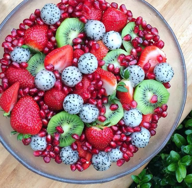 - 투명한 유리 볼이나 접시에 색감 대비되게 과일을 겹겹이 놓습니다.