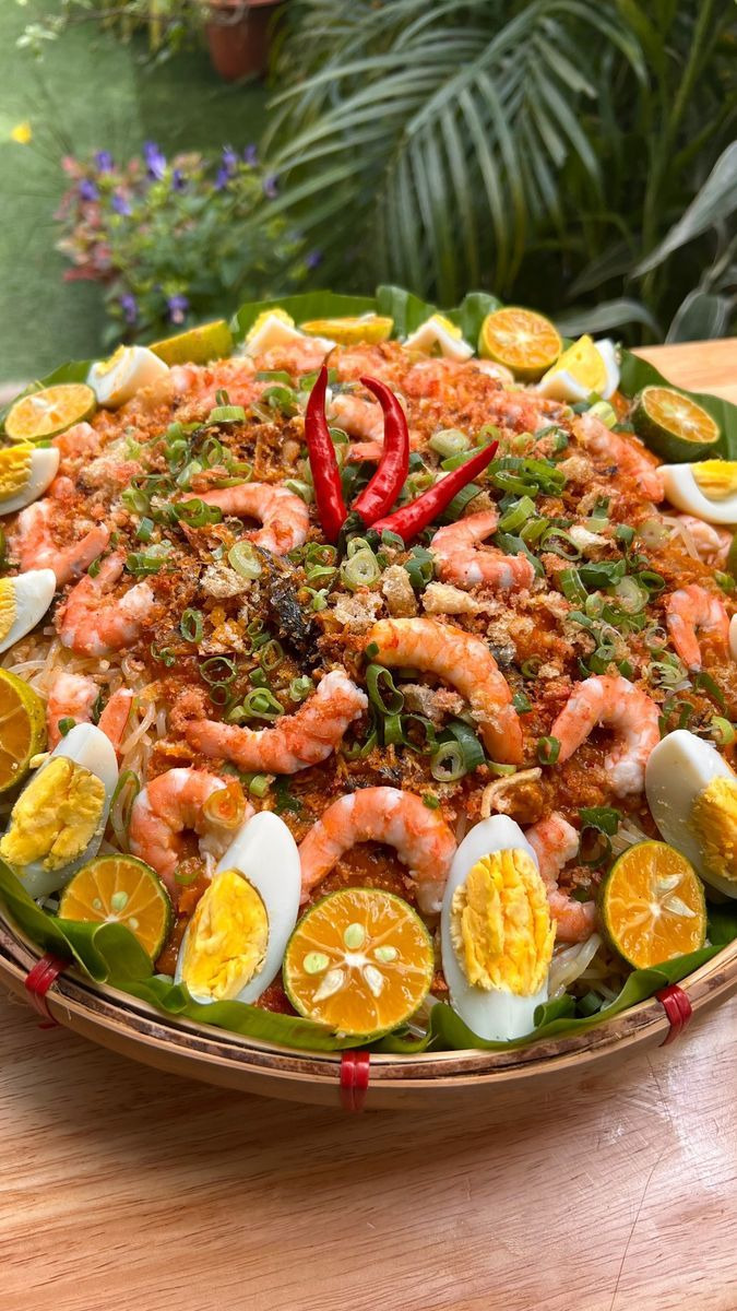 이 요리는 일반적으로 얇은 쌀국수 위에 새우를 기본으로 한 진한 소스를 듬뿍 얹고, 여러 가지 풍미 가득한 토핑(예: 삶은 달걀, 돼지고기 튀김, 새우, 잘게 썬 파, 마늘 등)을 올려서 만듭니다.